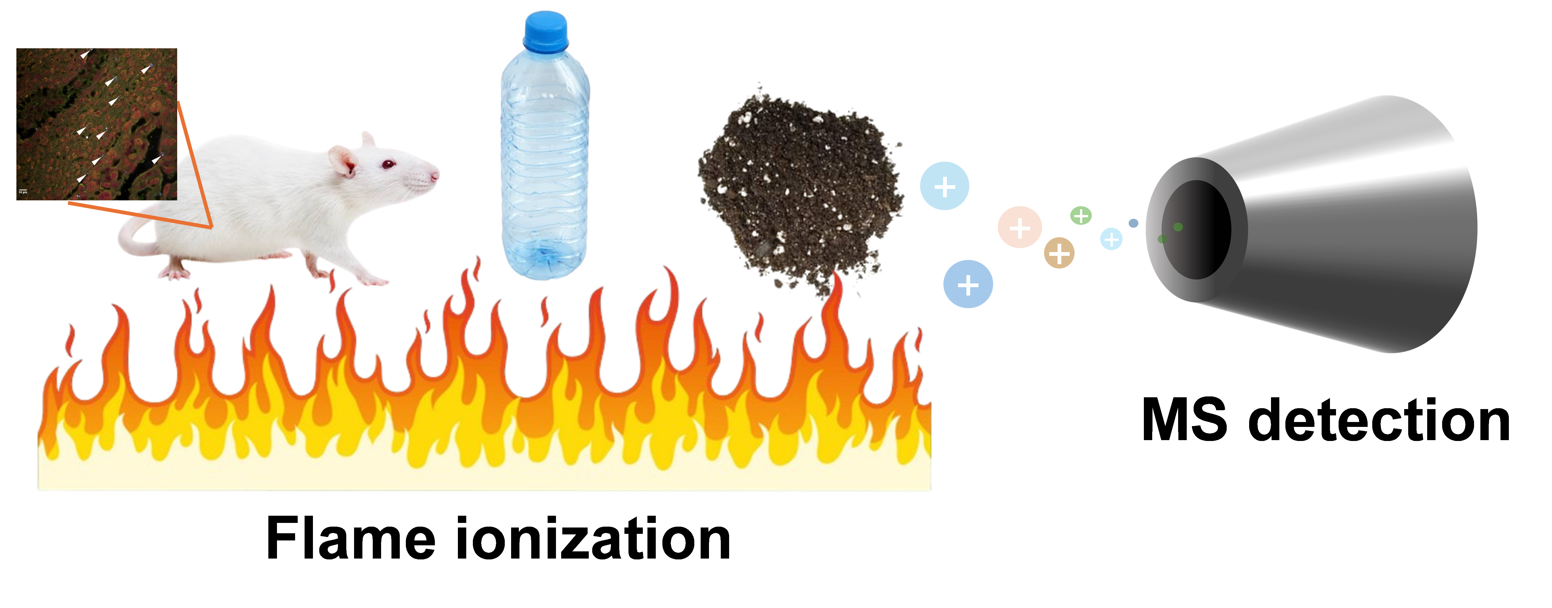 Microplastics (MPs) and nanoplastics (NPs) are pervasive pollutants and their analyses by traditional mass spectrometric methods require time-intensive sample preparation (e.g., extraction, digestion, and separation). We recently developed a rapid and novel method for detecting MPs and NPs using flame ionization mass spectrometry (FI-MS) in which a dried sample (e.g., powder, soil and tissue) is directly burnt or heated with a flame in front of the MS inlet. FI-MS enables decomposition and ionization of various plastics such as polyethylene terephthalate (PET) and polystyrene (PS), allowing for analysis to be completed as fast as 10 seconds per sample (Journal of Hazardous Materials, 2025, 493, 138322; US Patent Application No.: 63/742,089). As a demonstration of application of this technique, PET contaminants in 1 L of bottled water or in 0.65 L of apple juice contained in plastic bottles were quickly detected from a filter paper after sample filtration and brief drying. A 0.89 mg soil sample spiked with 6000 ppm PET microplastics was measured to contain 4.98 μg of PET (5595 ppm, quantitation error: 6.8 %). Strikingly, PS nanoplastics (200 nm size) in mouse placentas were successfully identified and quantified, highlighting the method’s ability to analyze biological tissue without tedious sample preparation. Overall, this study demonstrates the high potential of FI-MS for real-world sample analysis of MPs and NPs in environmental, biological, or consumer product samples.