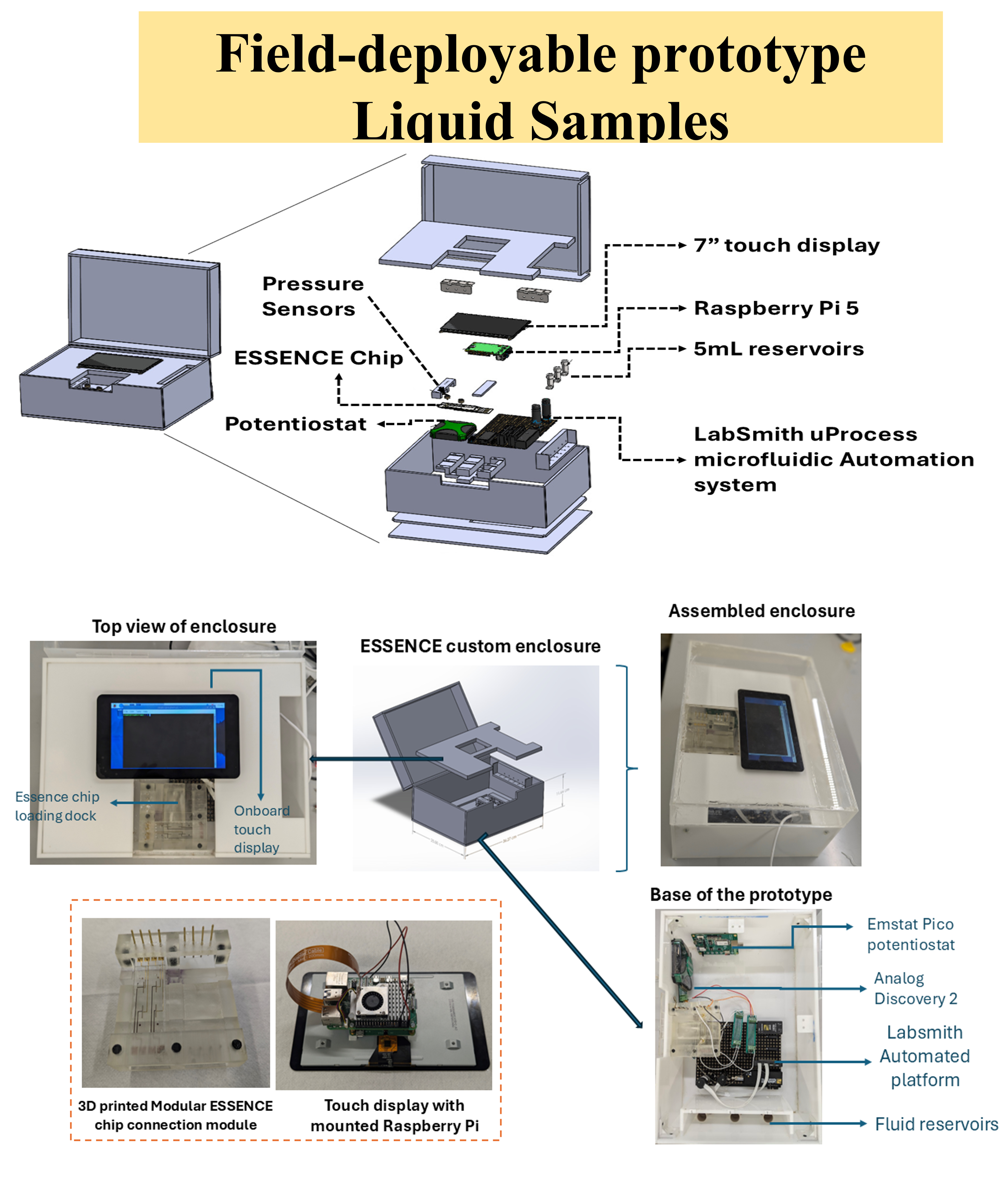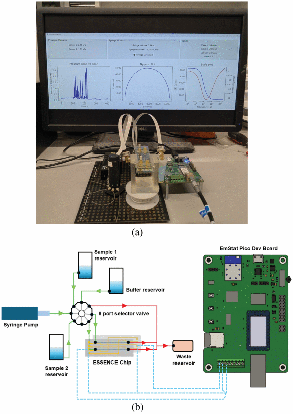 We unify microfluidic automation, embedded pressure monitoring, and electrochemical impedance spectroscopy (EIS) into a fully programmable platform that operates through open-source Python control. This system—centered around our ESSENCE (Electrochemical Shear-Enhanced Non-Planar Capacitive Electrode) chip—enables real-time diagnostics with minimal human intervention.