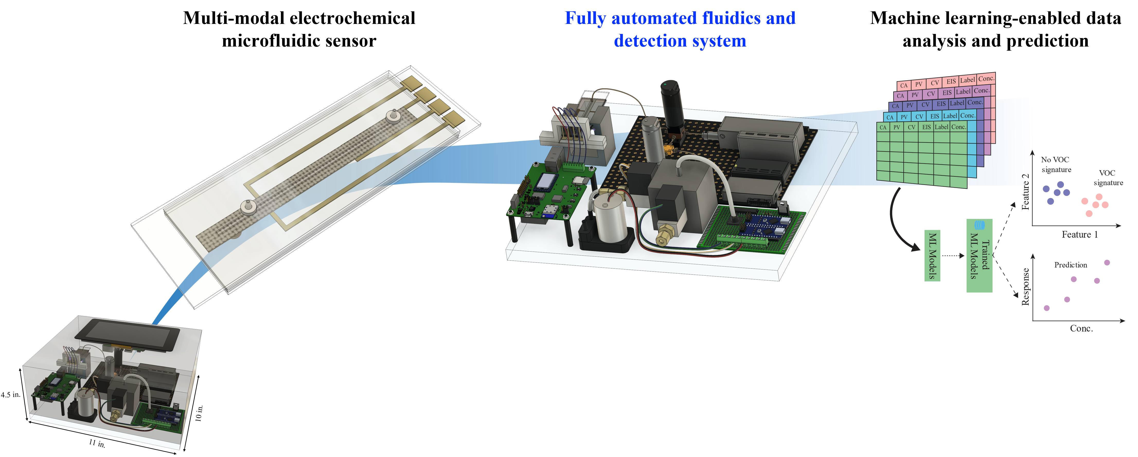 Our lab pioneers the development of AI/ML-integrated electrochemical sensors that eliminate the need for traditional equivalent circuit models (ECMs) in analyzing electrochemical impedance spectroscopy (EIS) data. This cutting-edge approach enhances the sensitivity, selectivity, and accuracy of chemical and biological sensing platforms by fully leveraging the rich information content across the entire impedance spectrum.