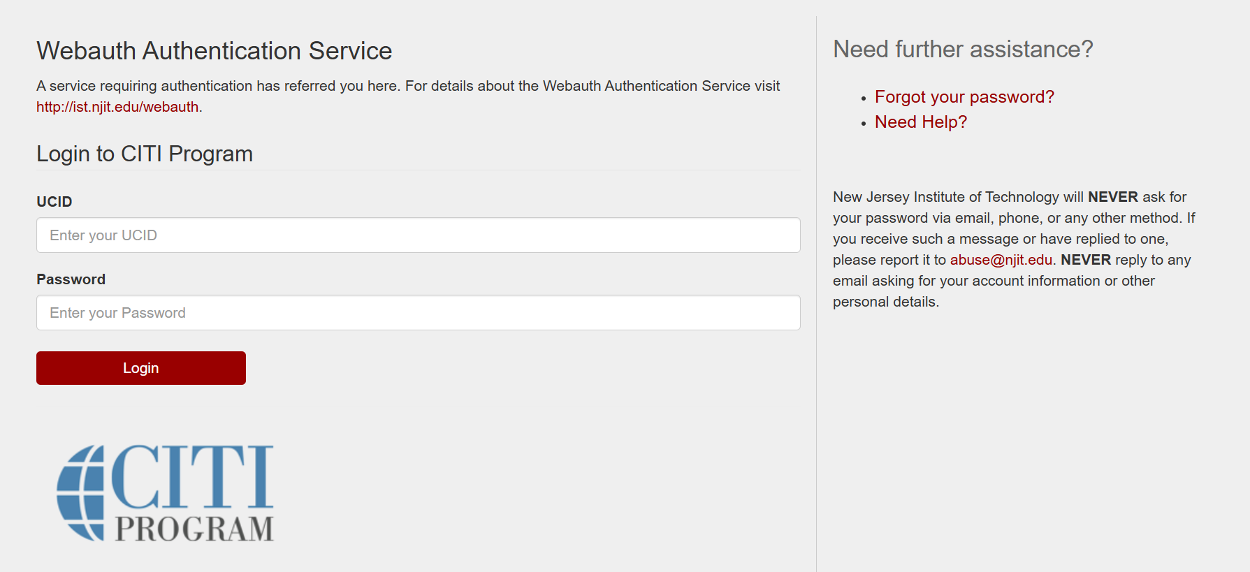 NJIT research compliance training is supported by CITI online training software. NJIT faculty, staff and students can access required compliance training modules via the NJIT CITI program portal which offers web-based training courses to fulfill research compliance training requirements. The CITI system is an external website that supports some of NJIT's required compliance training programs. CITI provides an online training and certification courses that are required by all students, post-docs and research staff in compliance with federal and university regulations.